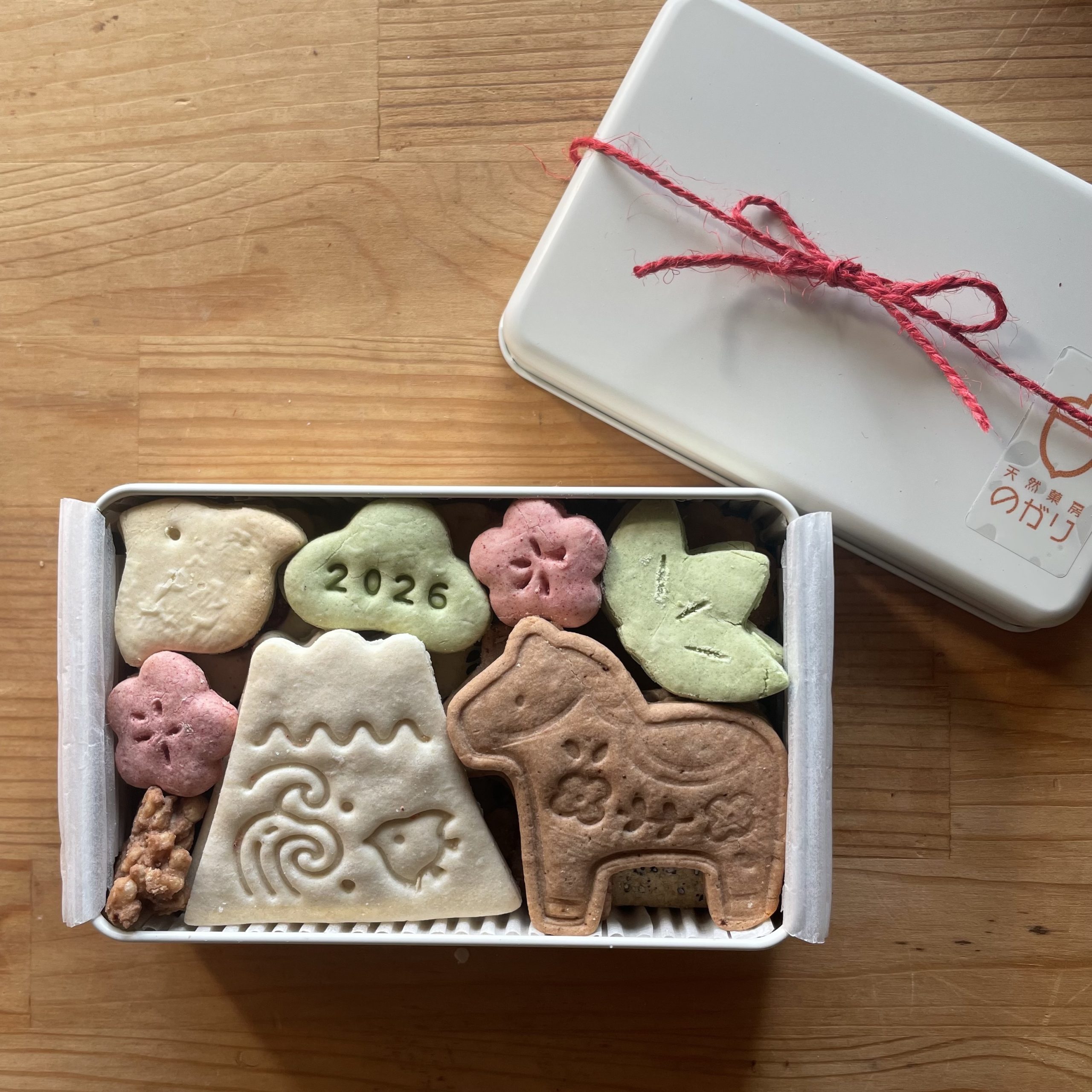 2026年、最初のクッキー缶は、2026年の干支は丑ということで、幸せを運ぶ馬ダーラナホースのクッキーをメインに、縁起が良い松竹梅や富士山クッキー、人気のさつまいもクッキーや玄米ショコラなどなど、新しい年を幸せな気持ちでスタートしていただけるようなクッキーたちをギュギュッと詰め込みました♪