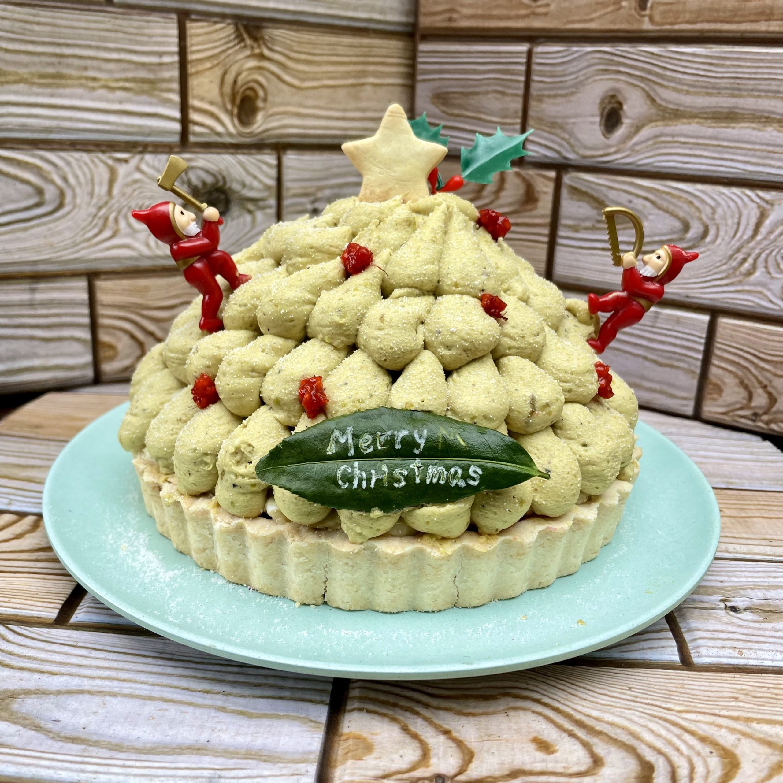 ザクザク米粉のタルトに豆乳カスタードクリーム、ベリージャム、ミックスベリー入りソイココナッツクリーム、そして濃厚なピスタチオクリームでもみの木をイメージしてデコレーションしたクリスマス限定のタルトです。