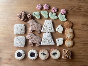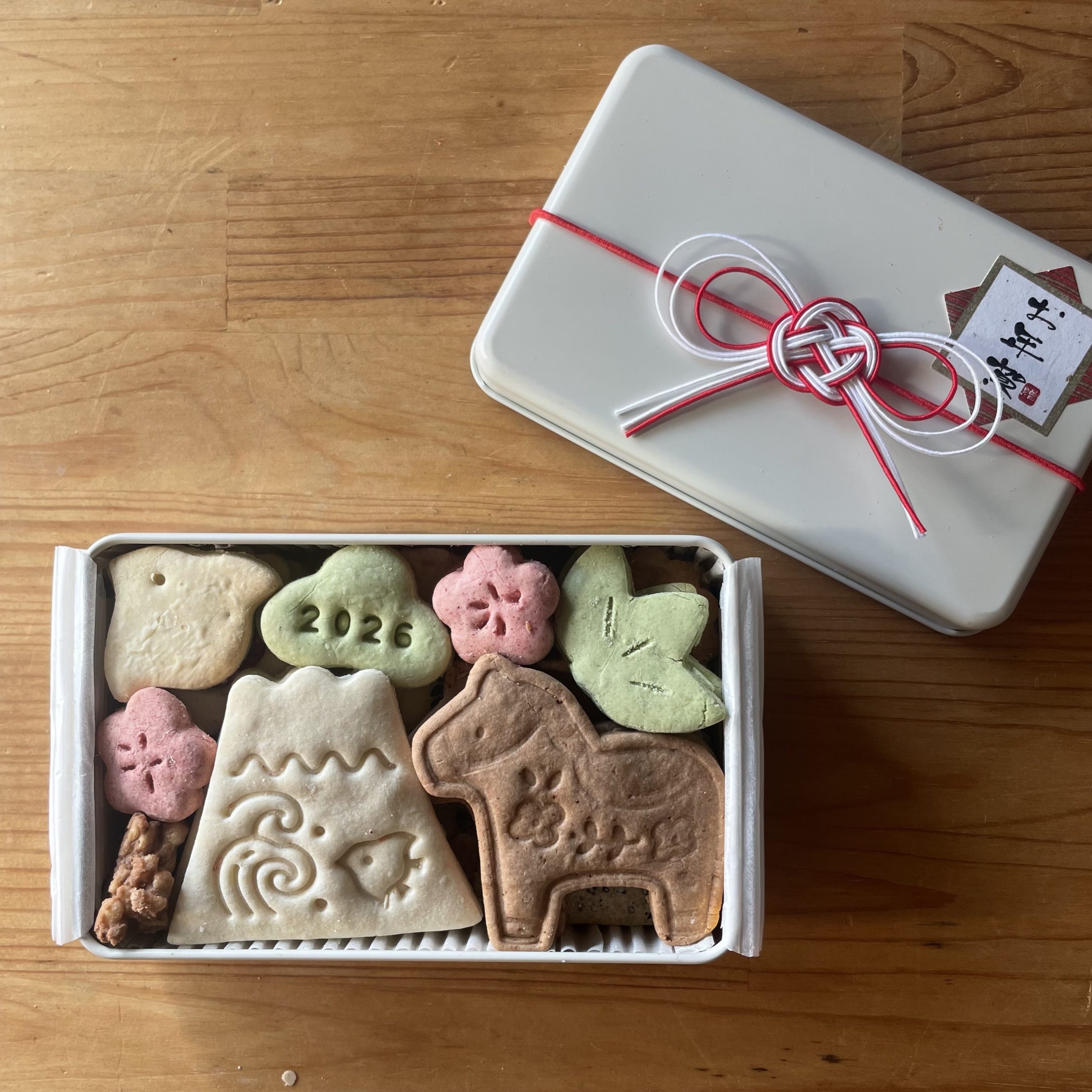 2026年、最初のクッキー缶は、2026年の干支は丑ということで、幸せを運ぶ馬ダーラナホースのクッキーをメインに、縁起が良い松竹梅や富士山クッキー、人気のさつまいもクッキーや玄米ショコラなどなど、新しい年を幸せな気持ちでスタートしていただけるようなクッキーたちをギュギュッと詰め込みました♪