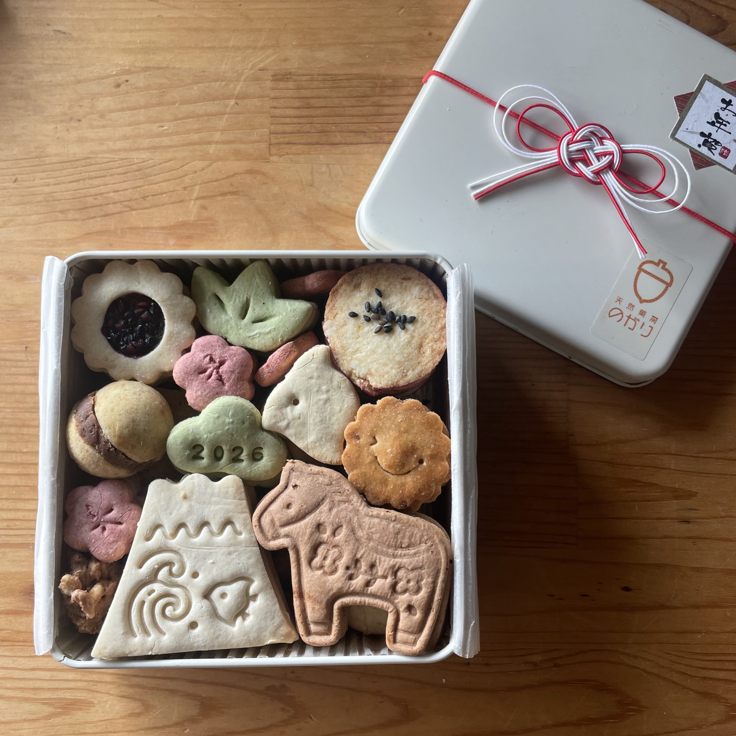 2026年、最初のクッキー缶は、2026年の干支は丑ということで、幸せを運ぶ馬ダーラナホースのクッキーをメインに、縁起が良い松竹梅や富士山クッキー、人気のさつまいもクッキーや玄米ショコラなどなど、新しい年を幸せな気持ちでスタートしていただけるようなクッキーたちをギュギュッと詰め込みました♪