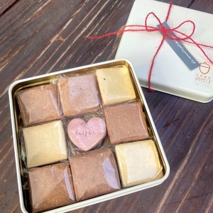 クラフトのboxに入った8個入りタイプ(プレーン2個、アーモンド、いちごみるくが2個づつ、ラムレーズンとピスタチオが1個づつ)と缶入りの9個入りタイプ(プレーン3個、アーモンド、いちごみるくが2個づつ、ラムレーズンとピスタチオが1個づつ)と2種類ありますので、お好みでお選びください♪