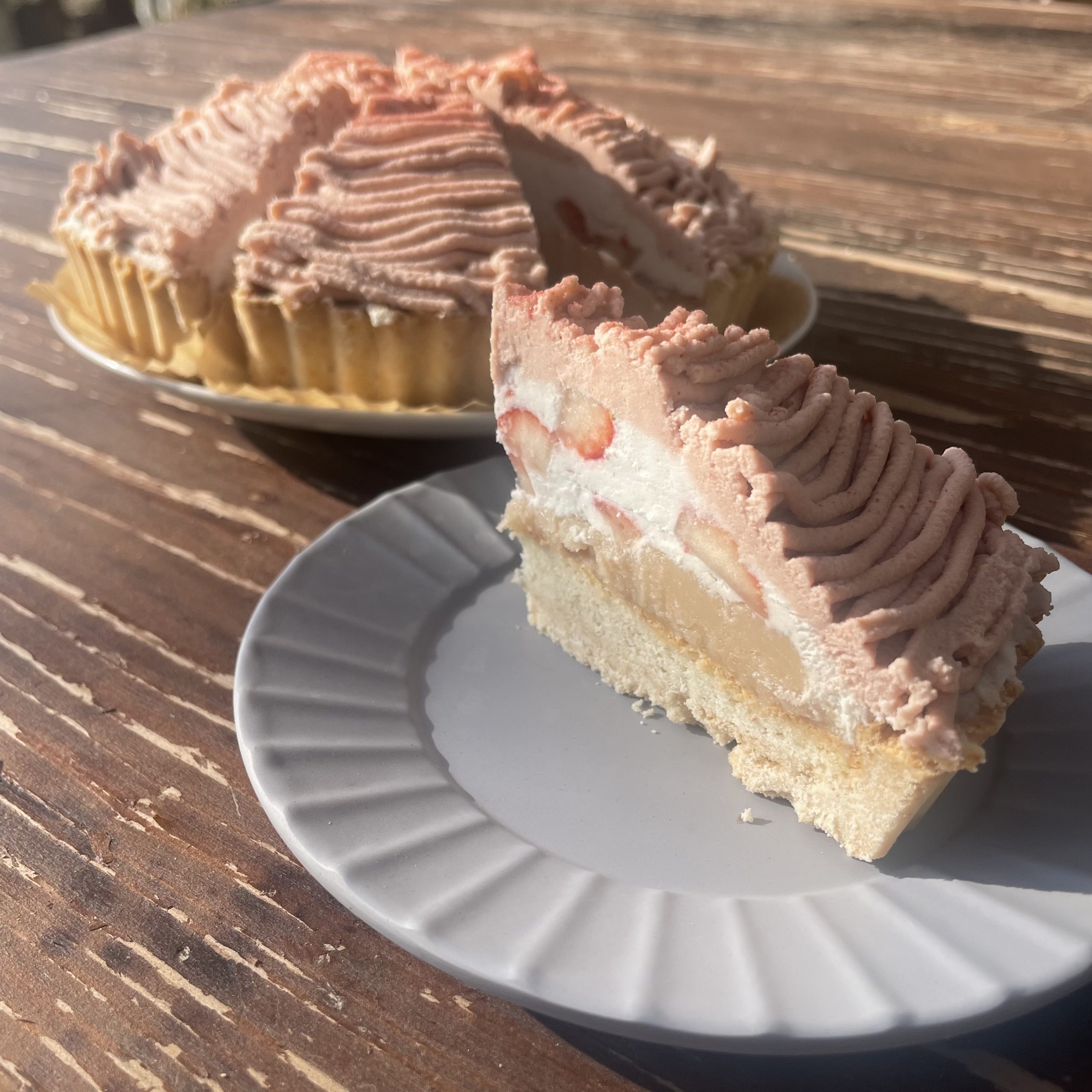 ザクザクタルトにアーモンドクリームを詰めて焼き上げ、自家製白あん、ゴロゴロ苺入りのココナッツクリーム、そして甘酸っぱい苺クリームを絞りました♪