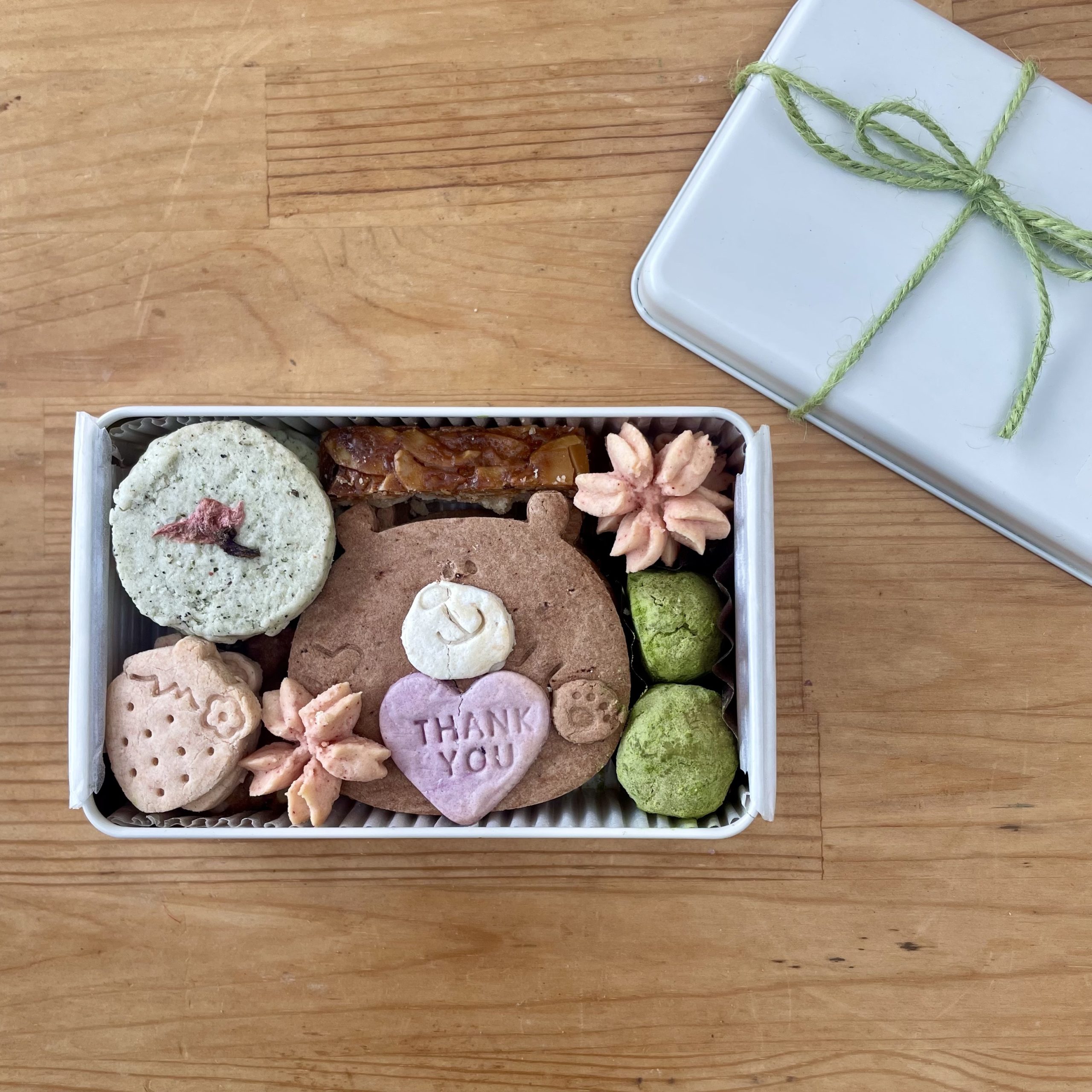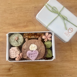 thank youメッセージを抱っこしたくまさんに感謝の気持ちを込めて、桜の花のクッキーやいちごクッキー、抹茶など春らしさも満開なくっきー缶にしてみました♪